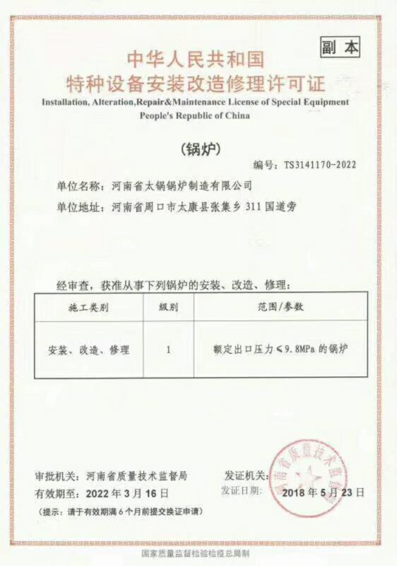 河南省太鍋鍋爐制造有限公司(原河南省太康鍋爐廠始建于1976年)始建于70年代初,經(jīng)40多年的艱辛探索,靠科技興業(yè),走科學(xué)管理之路,現(xiàn)已發(fā)展成為承接制造、安裝、設(shè)計大、中型供熱系統(tǒng),生產(chǎn):SZS燃油燃?xì)庹羝仩t、燃煤蒸汽鍋爐、燃油鍋爐、燃?xì)忮仩t、電加熱鍋爐、生物質(zhì)鍋爐、茶水鍋爐、有機(jī)熱載體鍋爐、熱風(fēng)鍋爐,蒸壓釜、燃油蒸汽鍋爐、燃?xì)庹羝仩t、燃油熱水鍋爐、燃?xì)鉄崴仩t并承擔(dān)安裝120噸熱水鍋爐、蒸汽鍋爐,生物質(zhì)鍋爐,加工制造一、二類蒸壓釜、壓力容器,化工機(jī)械的省一級**企業(yè)。